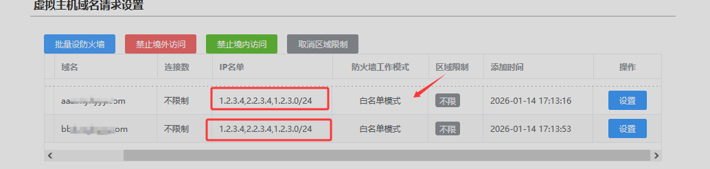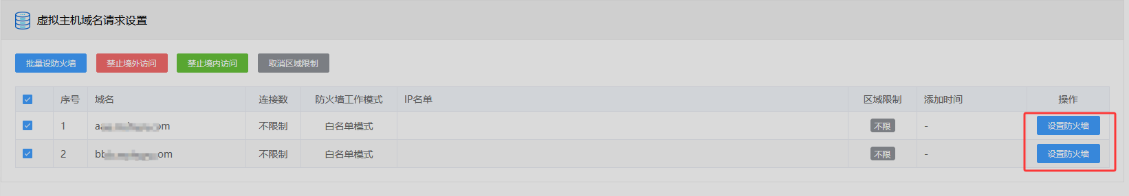 此处绑定的域名需要分别设置,即可以分别设置域名的IP访问限制。 也可以点击“批量设置防火墙” 对所有域名进行统一批量设置。
