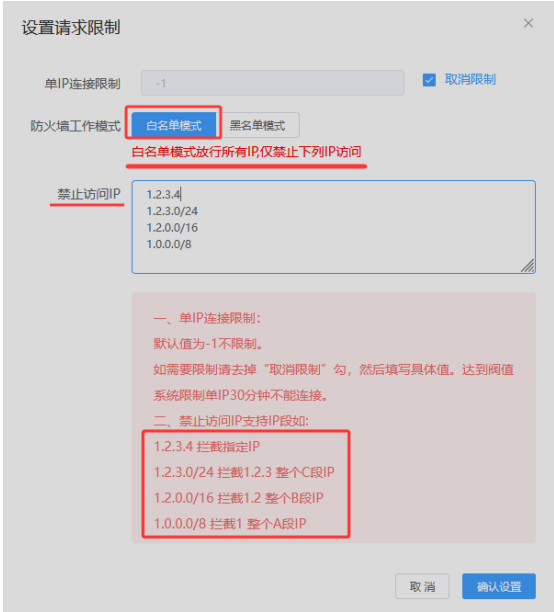此处需要选择“白名单模式” 再添加需要禁止访问的IP或IP段(一行一个)这样才是允许所有访问,禁止列表中IP或IP段访问。 如果选择为“黑名单模式”则为禁止所有访问,只允许列表中的IP或IP段访问。