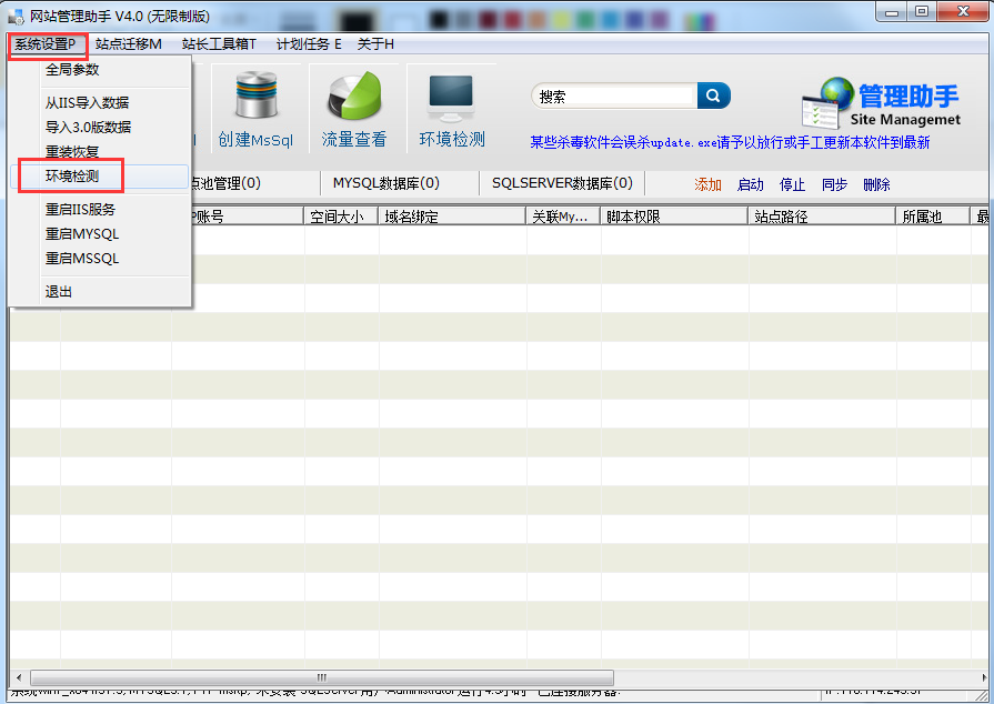 网站管理助手安装升级mysql5.6说明:安装会将原mysql5.1版本服务停止,数据不会丢失,但需要提前备份导出原数据,以便安装升级以后再导入恢复原数据。 安装前准备工作: http://www.35.com/faq/list.asp?unid=612 先参考此教程导出原来数据库中的备份。如果管理助手还是v3.0版本,点击下载最新版 ,解压到d:\SOFT_PHP_PACKAGE\目录。 一、打开网站管理助手,点击系统设置--环境检测。