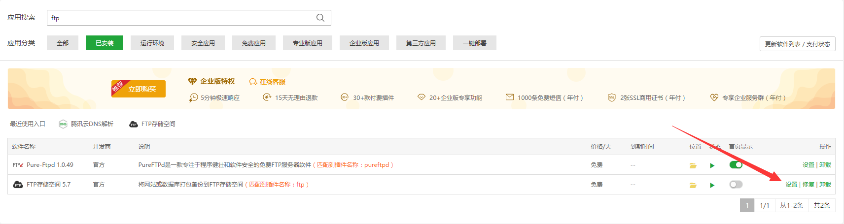 宝塔环境备份到三五互联FSS1、登陆宝塔面板-软件商店-第三方应用, 搜索ftp:找到FTP存储空间,点击安装