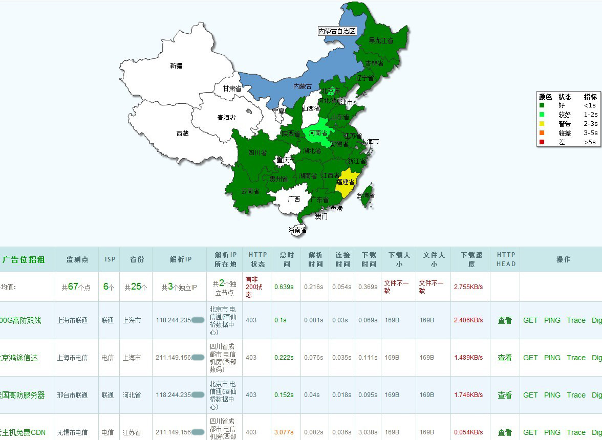问:3M带宽,要满足每个客户能达到100K/s的访问开放式,是否只支持3个人同时在线? 答:实际环境中,客户的访问请求不可能在同一秒同时达到,而是错开的。所以3M带宽也可以支持不小的访问量。具体能支持多少,要看网页、图片的大小以及客户访问的频率等实际情况。 问:为什么其他网站比如新浪、百度这些网站测试出来的速度这么快? 甚至我另外一个网站用的你们的虚拟主机测试出来也比放在弹性云上面的网站速度要快? 答:新浪、百度等网站的带宽资源都非常丰富,当然成本也与一台弹性云主机的成本不可同日而语。 虚拟主机一般是根据月流量限制的,并未限制峰值。虚拟主机的服务器一般是100M或1000M的带宽,所以用www.17ce.com等平台测试时,几十个节点并不能把服务器的带宽占满,因而能测试出真实的速度。 弹性云如果购买的带宽比较小,在测试时带宽已经占满了,服务器线路当时处于非常拥堵的状态。如果购买的带宽非常充裕,应该不会出现这种情况。 问:那如何测试弹性云主机的速度? 答:在服务器的网站目录放置一个较大的压缩包,在您的电脑上用“迅雷”下载它,应该可以测试出您的电脑连接到弹性云主机的速度。假设您的弹性云是2M带宽,您的电脑是4M adsl,那么下载速度应该在2Mbps; 如果您的弹性云是10M带宽,您的电脑是4M adsl,下载速度应该为4Mbps. 提供一个测试网址: cloudsppedtest.gotoip3.com (采用智能多线,10M带宽),可用于17ce测试对比。 下面几则图例可以充分说明,17ce上测试出来状况是否良好,跟主机的带宽有直接关系!即使是阿里云机房或我们提供的北京BGP机房,如果带宽很低,同样测试出来的效果很差。 用三五互联智能多线机房2M带宽测试出来全线飘红的问题,在您升级为10M或更多带宽的情况下,就可能实现很好的测试效果。但如果换为我们的北京BGP机房仍是2M带宽,同样测试效果会不理想。 另外测试中出现一个现象:同样是2m的主机,首次测出来很差,但稍后再测的时候就全线变绿了,这可能跟17ce的服务器有了缓存的原因。 图一:阿里云主机,2M带宽 图2:三五互联智能多线 10M带宽